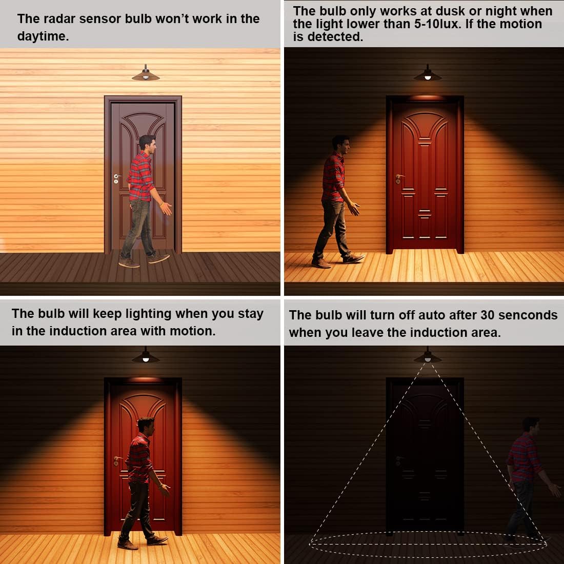 The radar sensor bulb is very sensitive to motion, There is a microwave sensor inside the bulb. Provides higher sensitivity than PIR infrared sensors bulbs, and works well even when the body temperature is the same as the ambient temperature.The radar led bulb will turn on automatically when you passed by within 13-26 feet in the dark,and turn off automatically within 30 seconds after you leave the area.